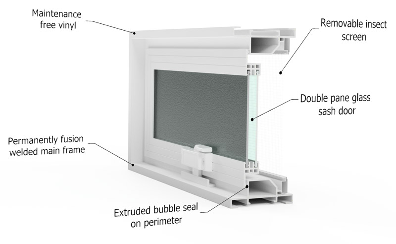 - Double pane, frosted glass sash door with extruded bubble seal on perimeter